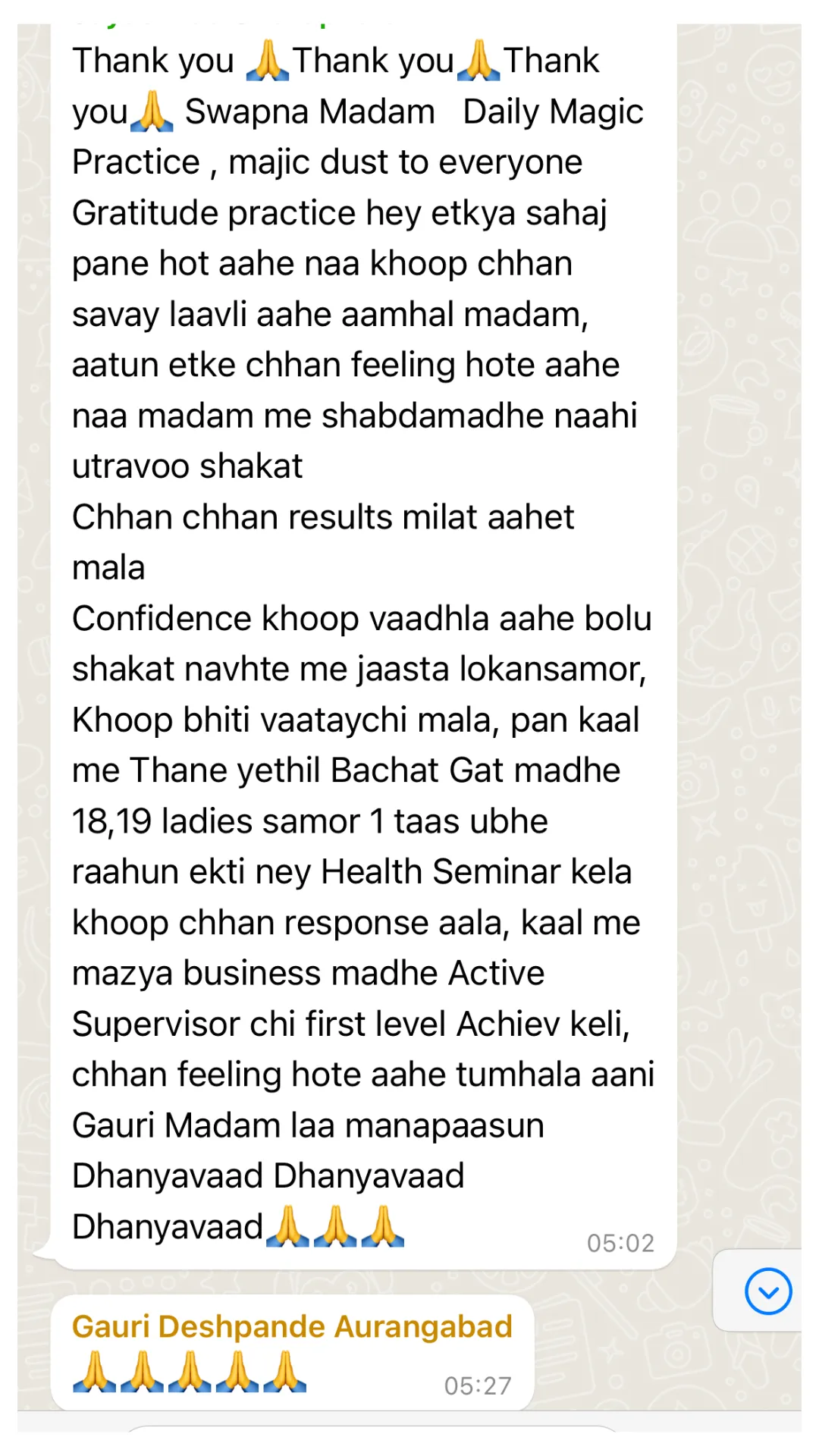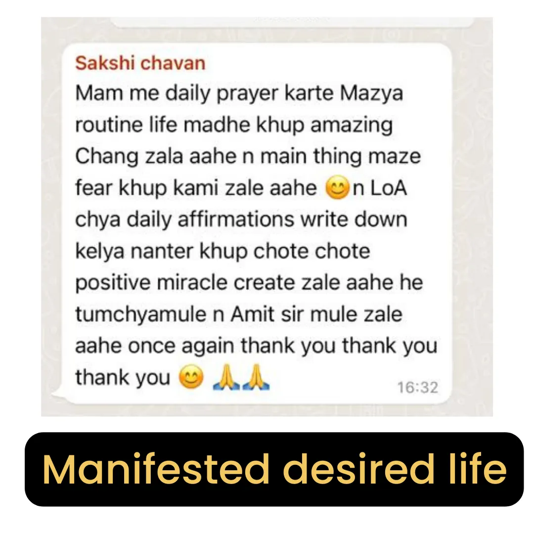 आपले विचारच आपली अंतिम स्थिती घडवत असतात. मॅजिकल ग्रॅटीट्यूड प्रॅक्टिसेसच्या सहाय्याने पद्धतशीरपणे आरोग्य,नातेसंबंध,करिअर आणि पैसा यामध्ये आमूलाग्र बदल मी स्वतः अनुभवलेला आहे आणि इतरांना सुद्धा त्यामध्ये मदत केलेली आहे.